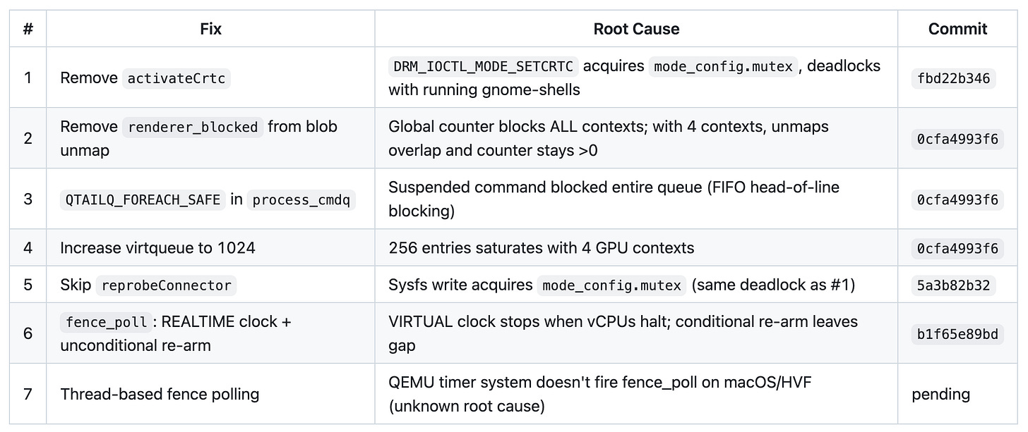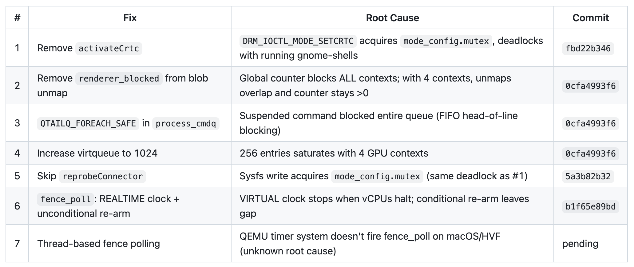 Every fix described below was discovered by starting 4 desktops in quick succession and tracing kernel stacks, QEMU process samples, and /proc/interrupts to find exactly where the system seized up. The bugs are all variations of the same theme: mechanisms designed for a single GPU context becoming global bottlenecks when shared across many.