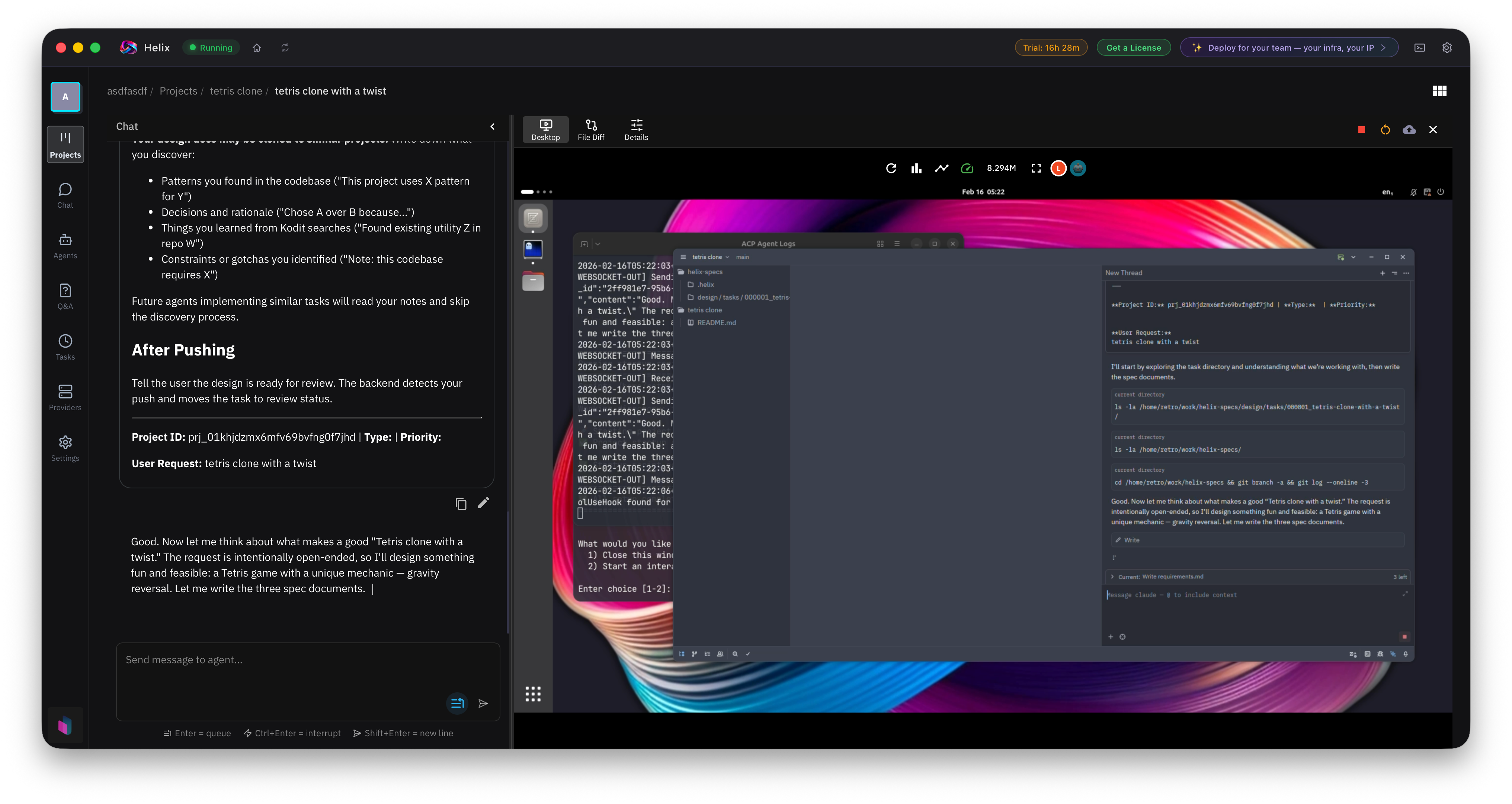 Helix Desktop gives every agent its own full Linux desktop — running in an isolated container with GPU acceleration. Humans can watch what their agents are doing in real time via H.264 video streams, jump in to collaborate through the same desktop interface, and manage their flock of agents from a mobile phone while on the go. Think of it as giving each agent their own workstation in a virtual office, where you can glance at any screen and tap on it to intervene.