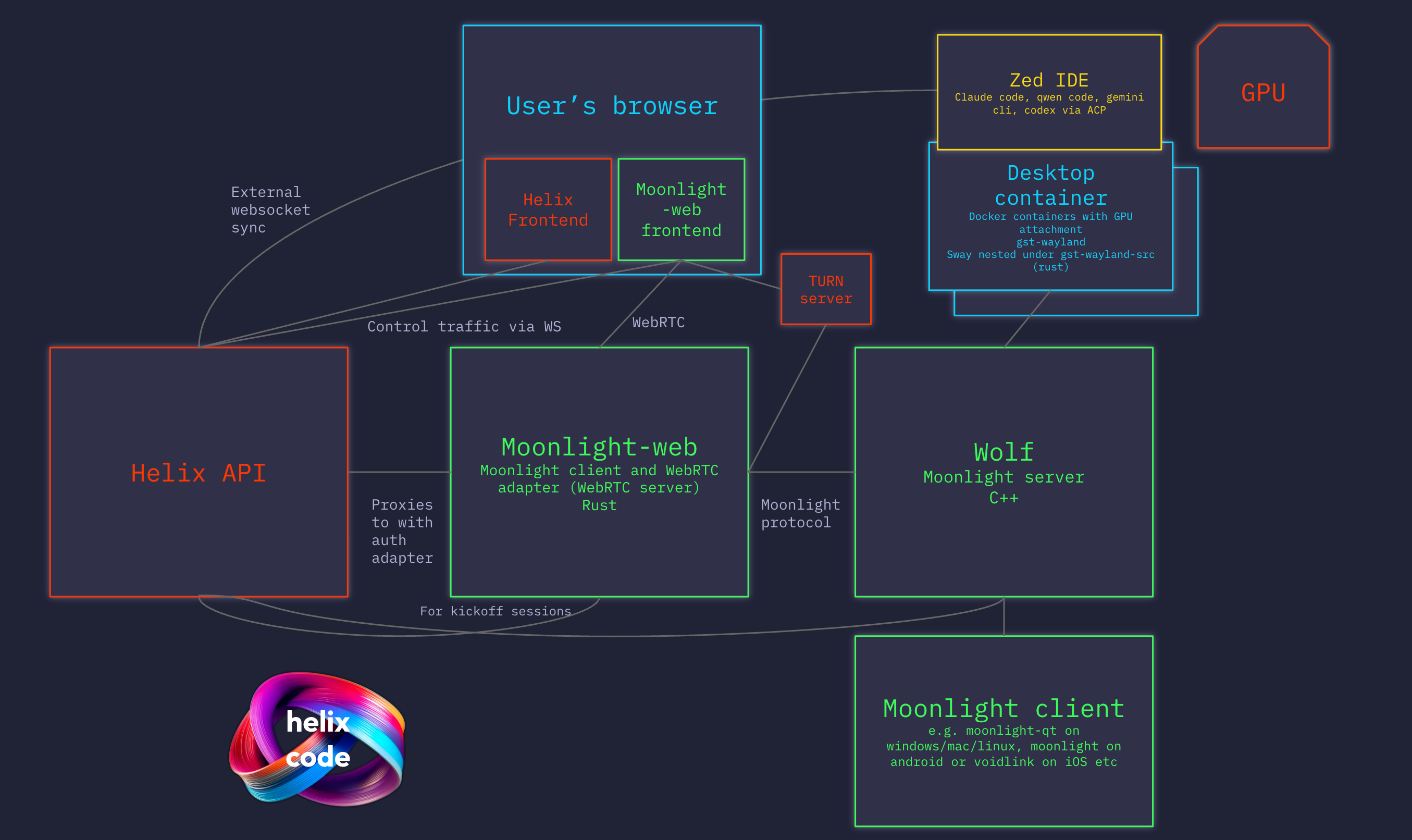That’s what we’re building with Helix Code. We run full Linux desktop environments in containers, each with a GPU attached. Inside each desktop runs an AI agent with access to development tools - Claude, code editors, browsers, terminals. Users connect to watch and interact with these agents as they work. And also get a 30,000-foot view of their fleet of agents, because we’re all going to become managers of coding agents whether we like it or not.