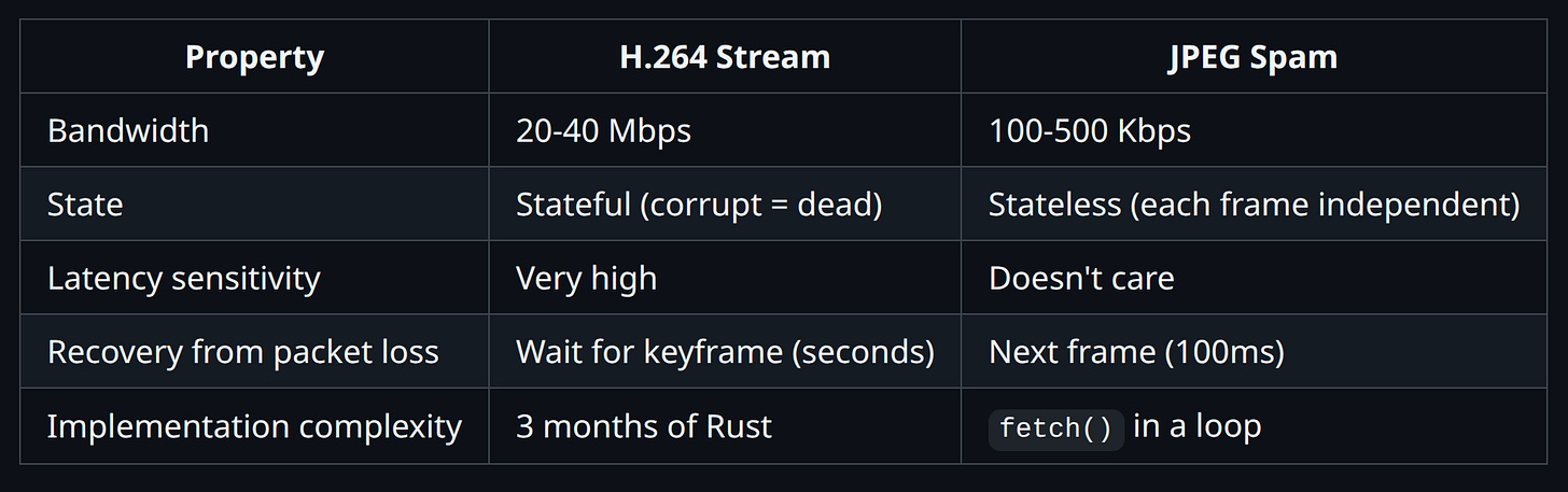 A JPEG screenshot is self-contained. It either arrives complete, or it doesn’t. There’s no “partial decode.” There’s no “waiting for the next keyframe.” There’s no “decoder state corruption.”