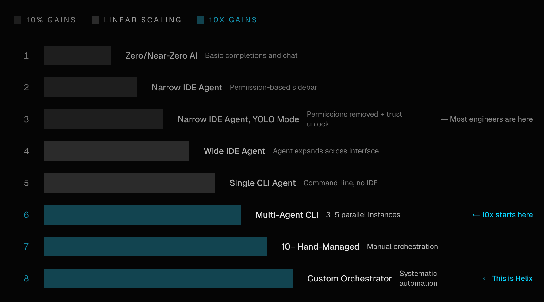 Helix Coding agents are built for step eight. But Helix works at every step along the way. You can start with self-hosted inference and RAG. Add single-agent coding sessions when your team is comfortable. Move to multi-agent orchestration when you’ve seen enough to trust the workflow.
