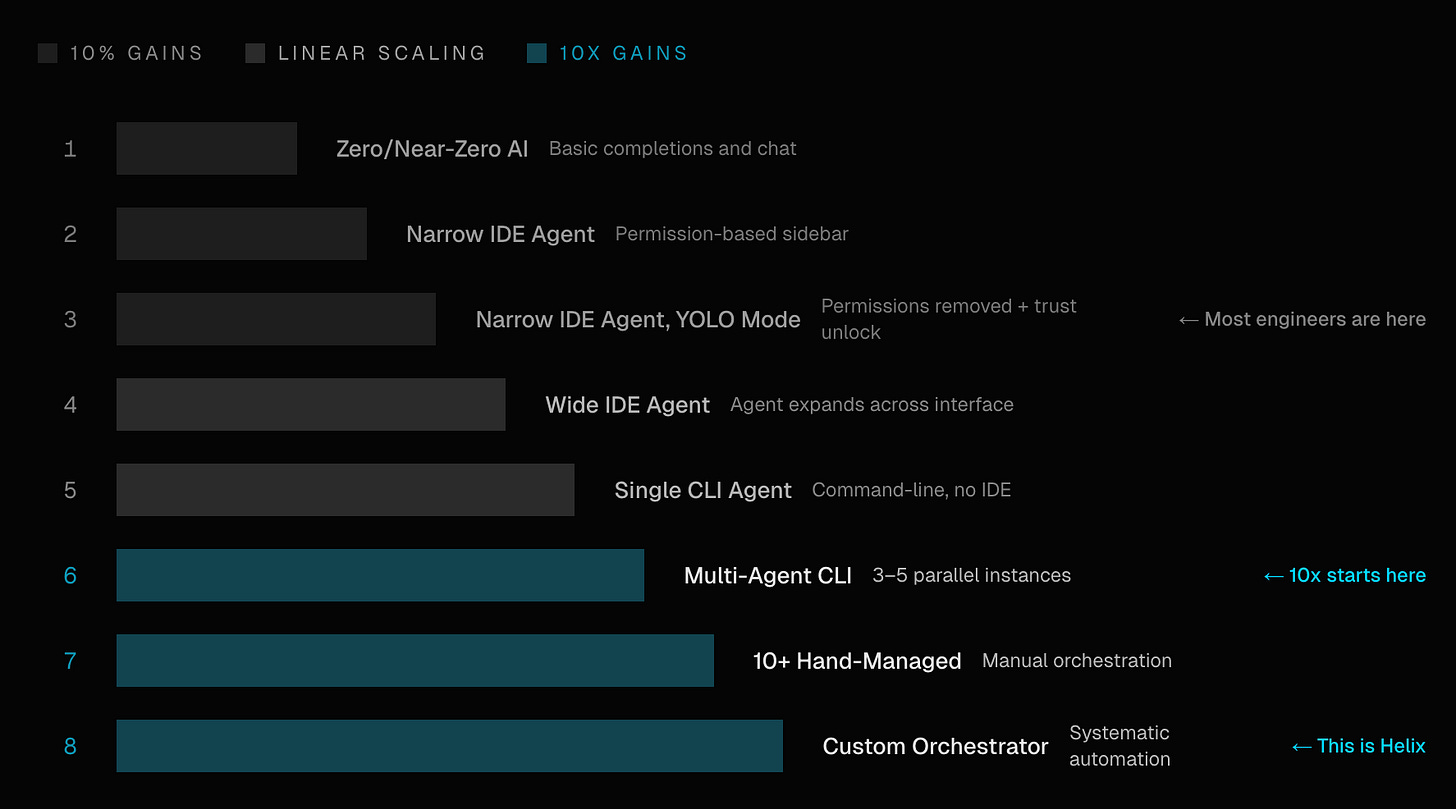 We have adopted this concept called the AI acceleration curve from Steve Yegge’s post from Jan 2026. It’s eight steps, from basic model inference all the way up to orchestrated agent fleets.