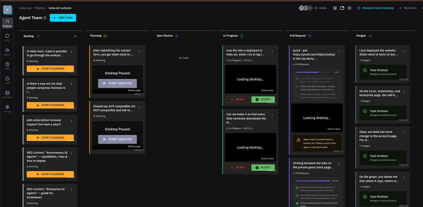 Helix changes that equation. Not by making one agent faster, but by giving you a fleet of them, each working in its own GPU-accelerated desktop, coordinated through a Kanban board you can watch in real time.